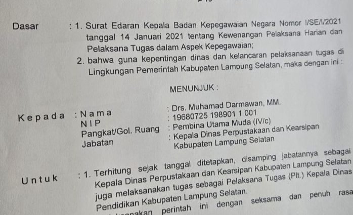 Penunjukan Muhammad Darmawan tertuang dalam Surat Perintah Pelaksana Tugas (SPPT) Bupati Lampung Selatan Nomor: 800.1.11.1/240/V.5/2025, yang merujuk pada Surat Edaran BKN Nomor I/SE/1/2021 tentang kewenangan pelaksana harian dan pelaksana tugas dalam aspek kepegawaian.