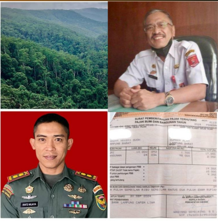 Lampung Barat, INC MEDIA — Komandan Kodim (Dandim) 0422/LB, Letkol Inf Rinto Wijaya, mempertanyakan adanya penarikan Pajak Bumi dan Bangunan (PBB) terhadap lahan di kawasan Taman Nasional Bukit Barisan Selatan (TNBBS), Kecamatan Bandar Negri Suoh (BNS), Lampung Barat.