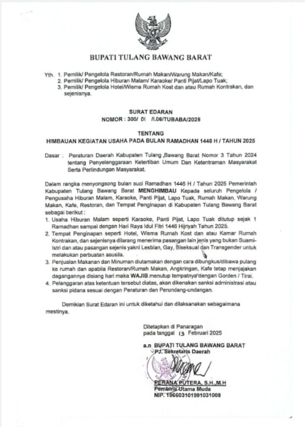 Keberadaan tempat hiburan malam ini jelas bertentangan dengan Surat Edaran Bupati Tulang Bawang Barat Nomor: 300/01/I.06/TUBABA/2015, yang menginstruksikan penutupan tempat hiburan malam selama bulan Ramadan hingga Idulfitri 2025. Namun, kenyataannya, aturan ini tampak tidak dipatuhi, bahkan pengawasan dari pihak berwenang terkesan longgar.