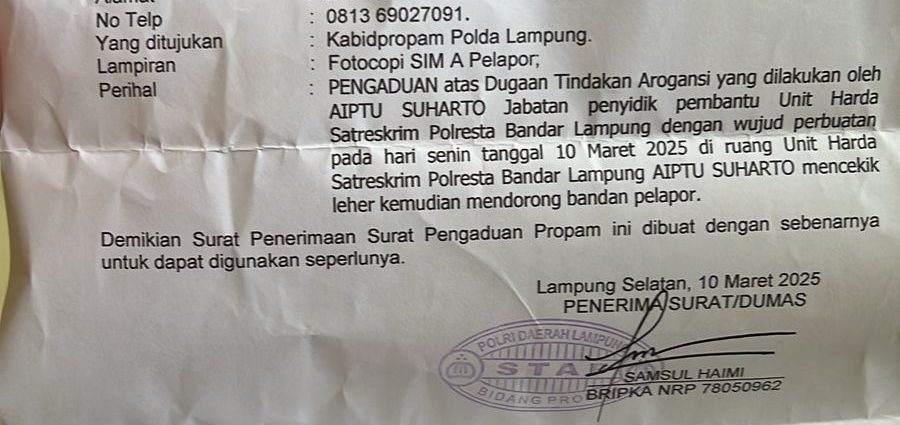Wiraswasta di Bandar Lampung Melapor ke Propam Polda Lampung, Mengaku Dicekik oleh Oknum Penyidik2025-03-12 By: Haris Efendi On: 12 Maret 2025 In: Hukum
