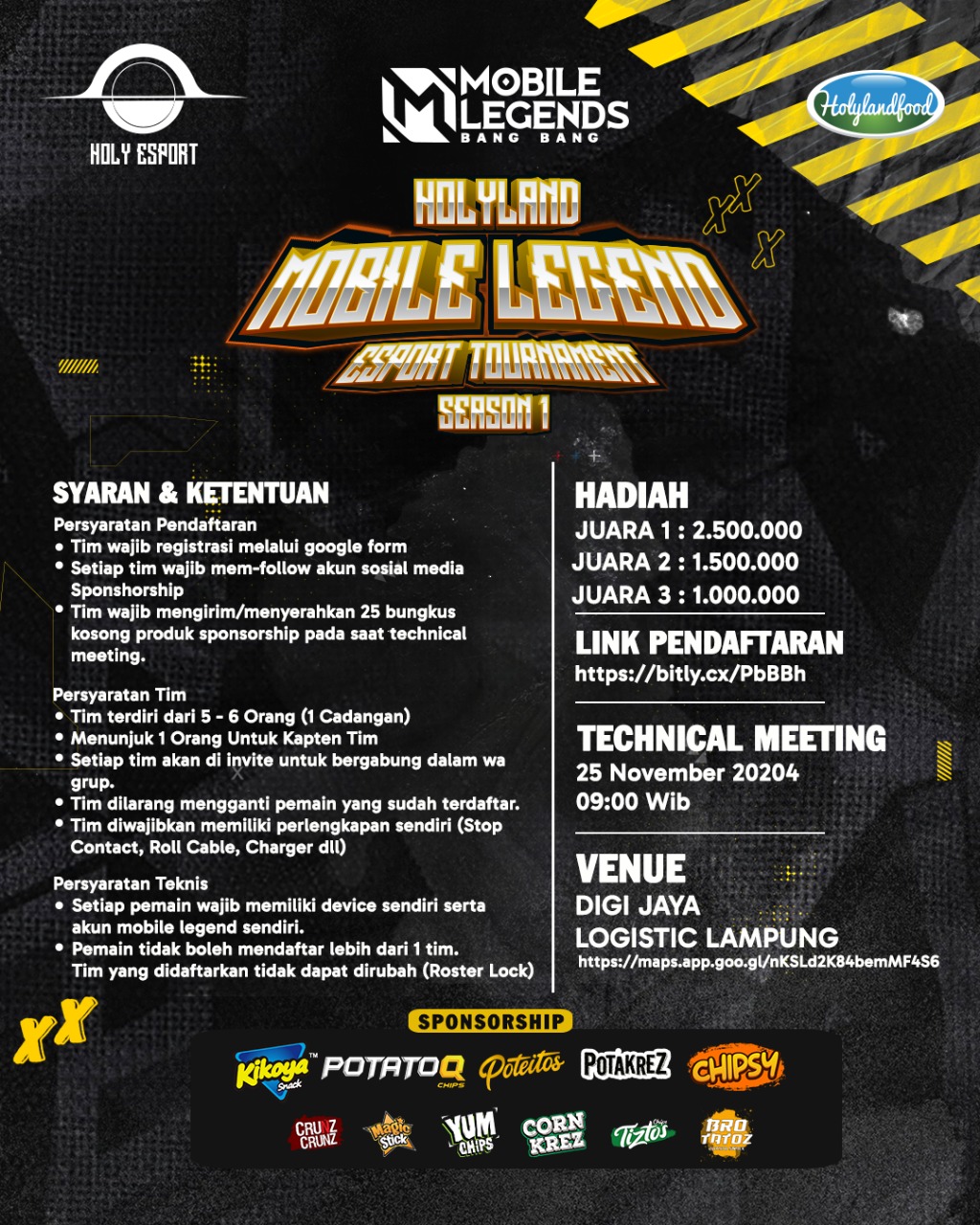 ” Pendaftaran dibuka untuk umum, mulai dari tanggal 1 sampai 24 November 2024, secara online. Syaratnya sangat mudah, peserta hanya cukup membawa 25 bungkus kosong produk PT. Holyland Food Indonesia, seperti Poteitos, Chipsy, Yumchips, Corn Krez, Tiztos, Magicstik, Kikoya, Potato Q dan Potakrez serta Sponsor Package sebesar Rp. 50.000,” Jelas M. Solehudin.