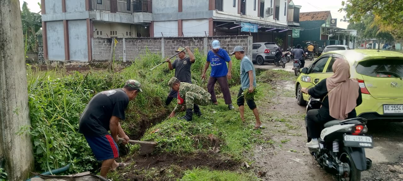 Babinsa Kelurahan Tanjung Senang, Serma Usmawan, bersama warga bergotong royong membersihkan drainase dan rumput liar dalam kegiatan Jumat Bersih di Jalan Raflesia, Bandar Lampung, Jumat (10/04/2026). (Dok. Babinsa)