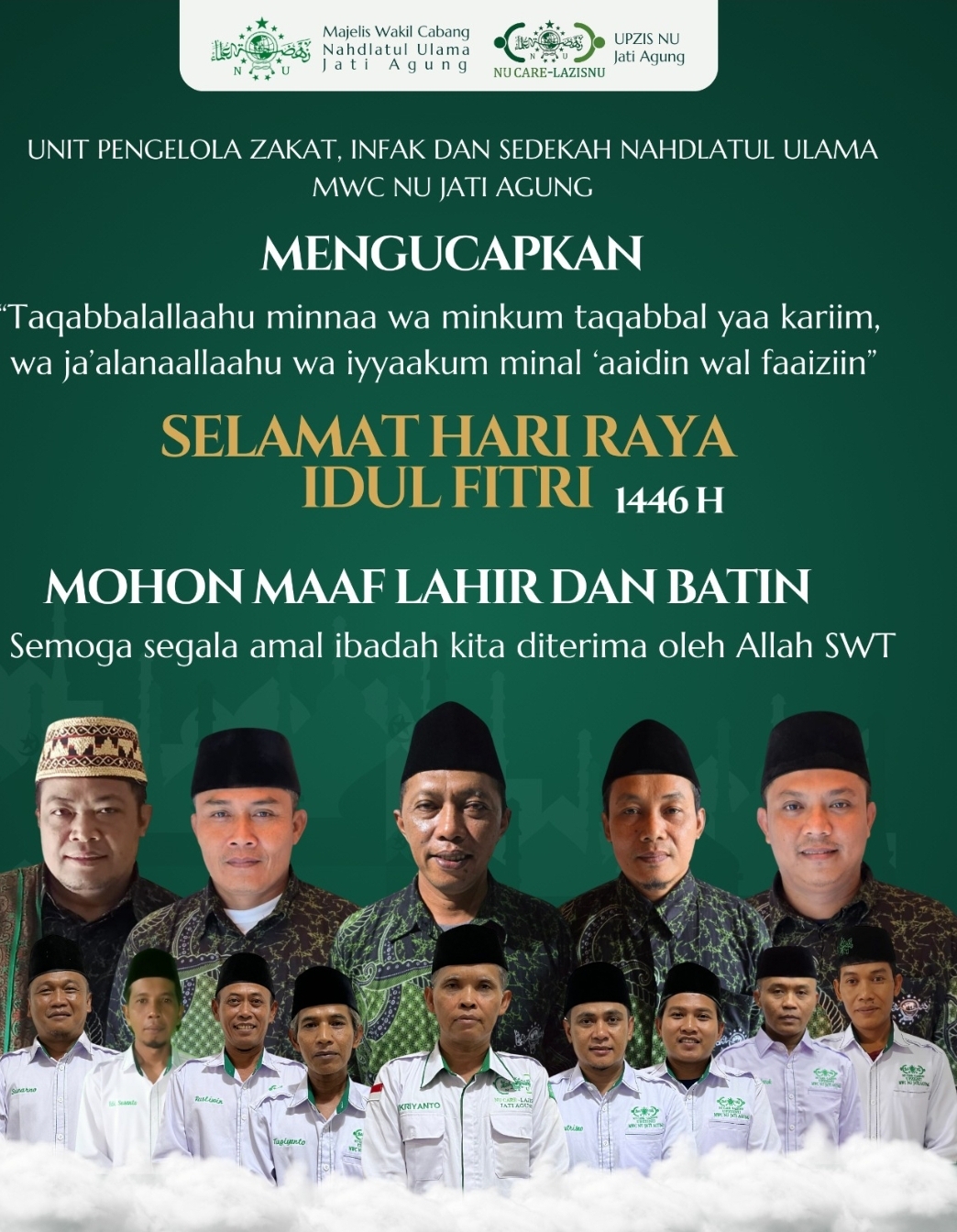 JATI AGUNG, INC MEDIA, – Majelis Wakil Cabang Nahdlatul Ulama (MWC NU) Jati Agung bersama Unit Pengelola Zakat, Infak, dan Sedekah (UPZIS) NU Care-LAZISNU Jati Agung mengucapkan selamat Hari Raya Idul Fitri 1446 H kepada seluruh umat Islam.