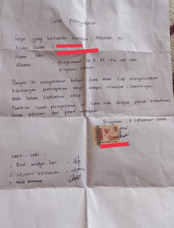 ” Sekira pada tanggal 24 dan 25 Januari 2022 beras mulai saya kirim ke SA. Singkat cerita, memang pembayaran bansos itu biasanyan setelah tanggal kirim itu temponya 10 harian. Tapi setelah 10 hari kok nggak ada pembayaran dari SA, kemudian SA saya datangi, kata dia bansos nggak jadi keluar, jadi beras nggak jadi dibagikan. Dia minta waktu tenggang sampai bansos mulai jalan lagi, tetapi setelah bansos jalan lagi dibulan berikutnya, SA cuma nyicil dan memberikan jaminan Sertipikat tanah dan bukan atas nama SA sendiri, melainkan dengan nama orang lain atas nama Juheni dengan luas tanah 531 m,” Beber Wawan.