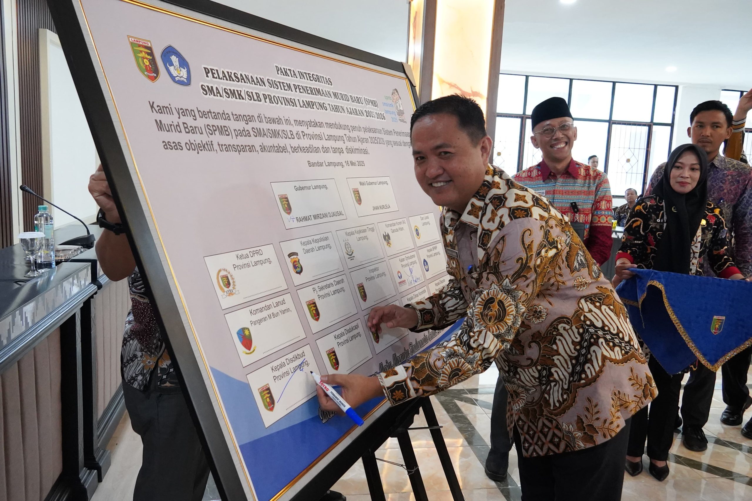 Foto Dok. Haris Efendi: Kepala Dinas Pendidikan provinsi Lampung Thomas Americo saat melakukan penandatanganan pakta integritas dalam acara meluncurkan Sistem Penerimaan Murid Baru di Kantor Gubernur Lampung, Jumat (16/05/2025).