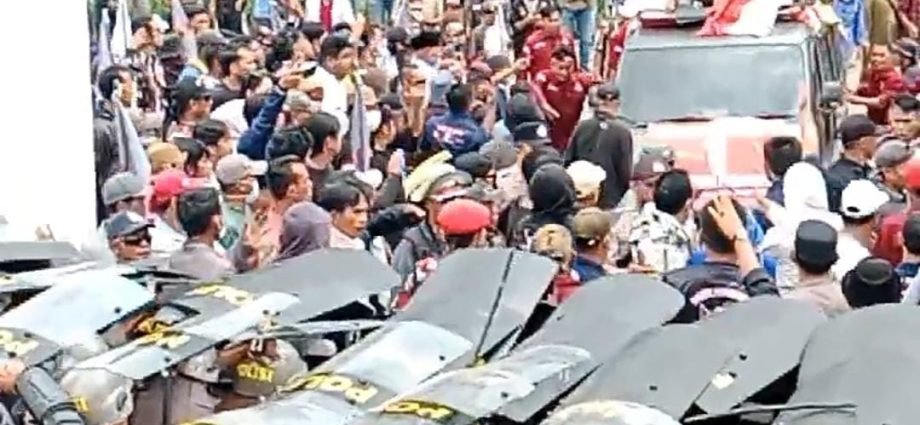 “Saya tidak akan mengizinkan seluruh massa masuk karena ini adalah objek vital. Saya meminta perwakilan sepuluh orang untuk masuk dan menyampaikan aspirasi,” ujar AKBP Maya.